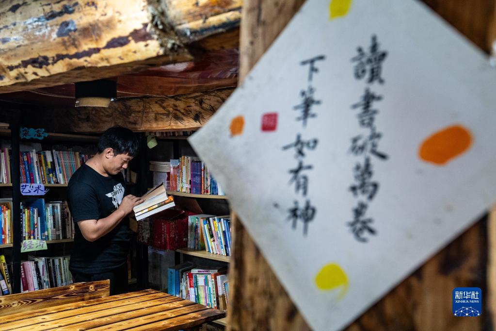 7月5日,甘文勇在“半山花語(yǔ)”書(shū)屋整理書(shū)籍。新華社記者 江文耀 攝