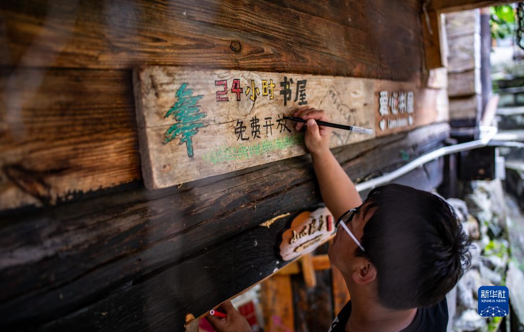 7月6日,甘文勇在修繕書(shū)屋的木牌。新華社記者 江文耀 攝