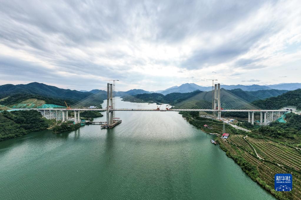 這是7月7日在湖南省益陽(yáng)市安化縣拍攝的官新高速雪峰湖大橋施工現場(chǎng)(無(wú)人機照片)。