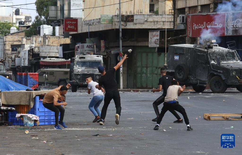 7月7日,抗議者在約旦河西岸城市納布盧斯向以色列軍車(chē)投擲石塊。