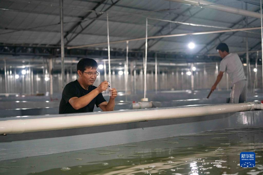 7月7日,在滄州渤海新區黃驊市一家水產(chǎn)養殖有限公司養殖車(chē)間,工人在檢驗養殖池水質(zhì)。