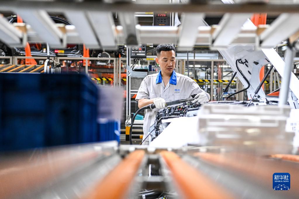 在位于吉林長(cháng)春的一汽-大眾長(cháng)春生產(chǎn)整車(chē)制造一部總裝一車(chē)間,工人在生產(chǎn)線(xiàn)上裝配車(chē)輛(6月12日攝)。