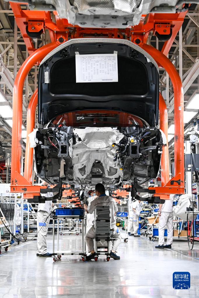 在位于吉林長(cháng)春的一汽-大眾長(cháng)春生產(chǎn)整車(chē)制造一部總裝一車(chē)間,工人在生產(chǎn)線(xiàn)上裝配車(chē)輛(6月12日攝)。