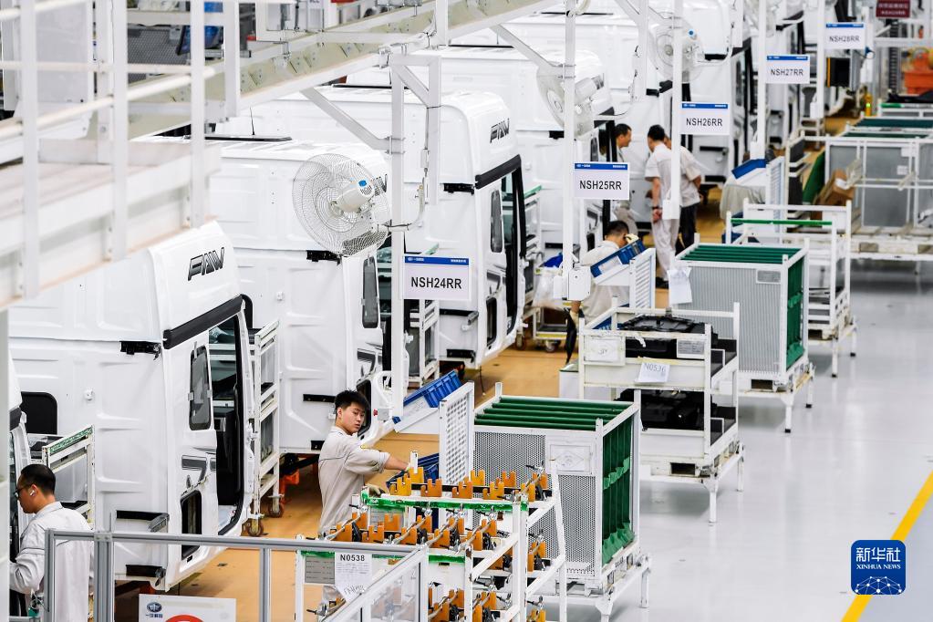 工作人員在一汽解放J7智能工廠(chǎng)內進(jìn)行車(chē)輛裝配作業(yè)(6月27日攝)。