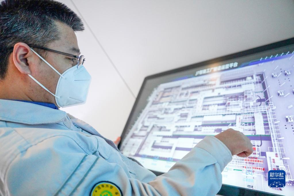 在位于吉林長(cháng)春的一汽解放J7智能工廠(chǎng)內,車(chē)間主任王一強在智造運營(yíng)平臺的電子屏上查看生產(chǎn)情況(2022年12月27日攝)。