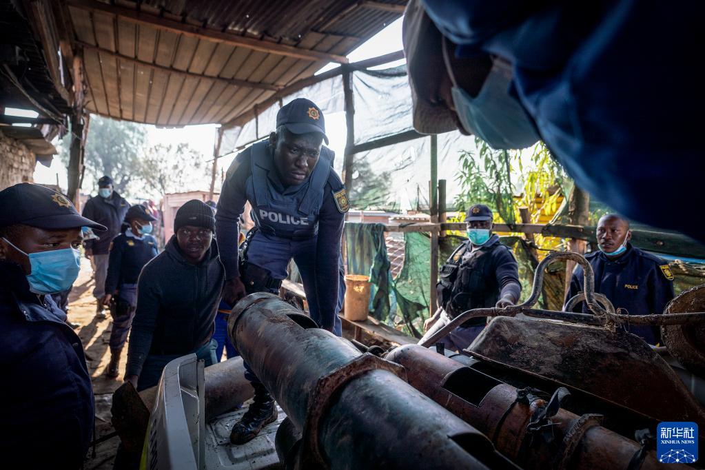 7月6日,警察在南非豪滕省埃庫爾胡萊尼市的事發(fā)現場(chǎng)轉移氣罐。