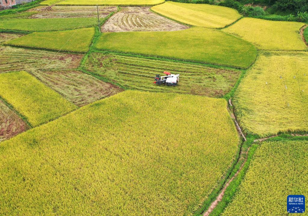 一臺收割機在南寧市橫州市新福鎮搶收早稻(7月7日攝,無(wú)人機照片)。