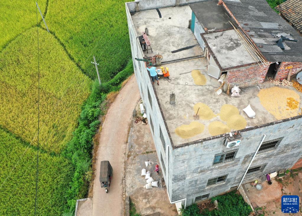 南寧市橫州市新福鎮農民將剛剛收割的早稻吊上屋頂,準備晾曬(7月7日攝,無(wú)人機照片)。
