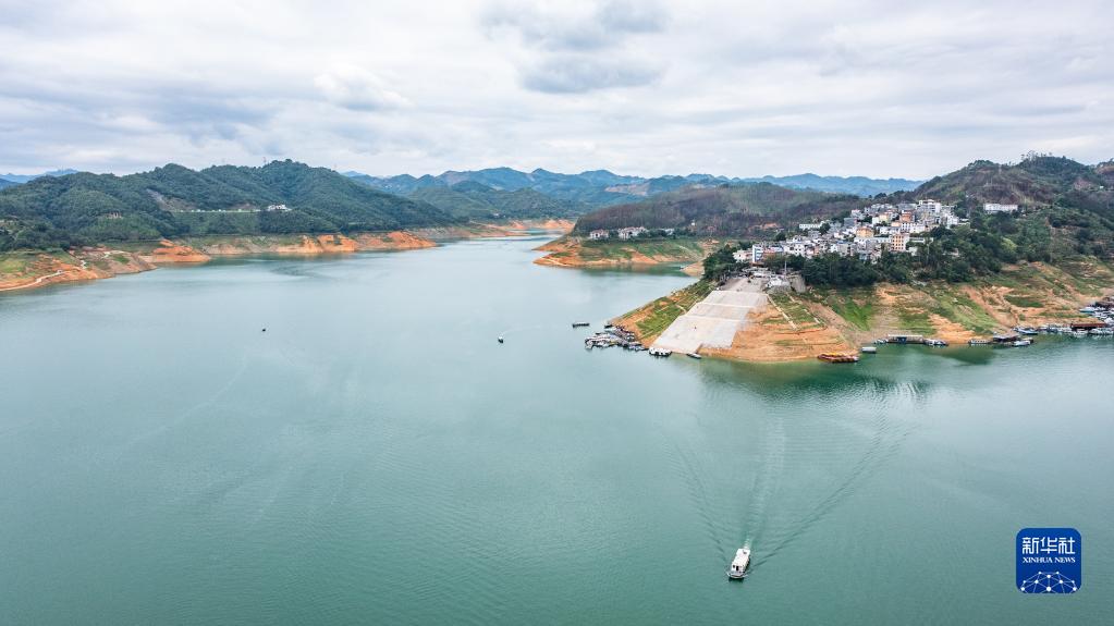 船只從萬(wàn)峰湖南盤(pán)江鎮1號碼頭駛出(7月5日攝,無(wú)人機照片)。