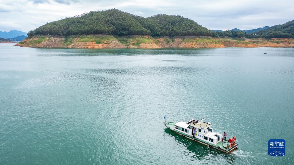 貴州省興義市交通運輸海事中隊的工作人員駕駛執法船在萬(wàn)峰湖水域巡檢(7月5日攝,無(wú)人機照片)。