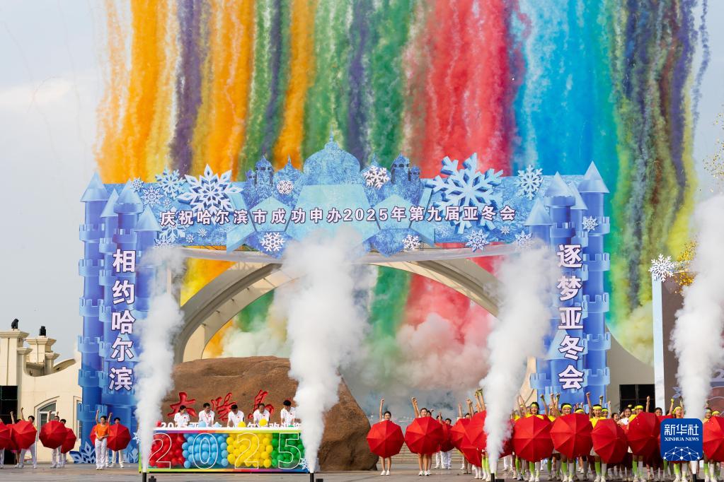 7月8日,在哈爾濱市太陽(yáng)島景區太陽(yáng)石廣場(chǎng),人們慶祝哈爾濱市獲得2025年第九屆亞洲冬季運動(dòng)會(huì )舉辦權。