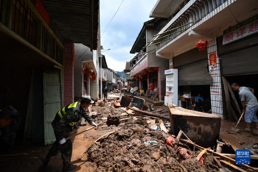 7月2日,在湖南省湘西土家族苗族自治州古丈縣巖頭寨鎮草潭村,當地應急民兵協(xié)助村民清理淤泥和垃圾。