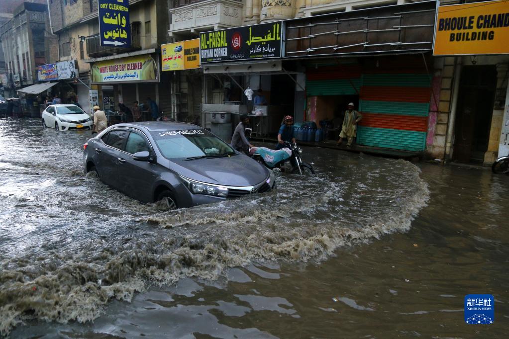 7月7日,車(chē)輛在巴基斯坦海得拉巴積水的道路上行進(jìn)。