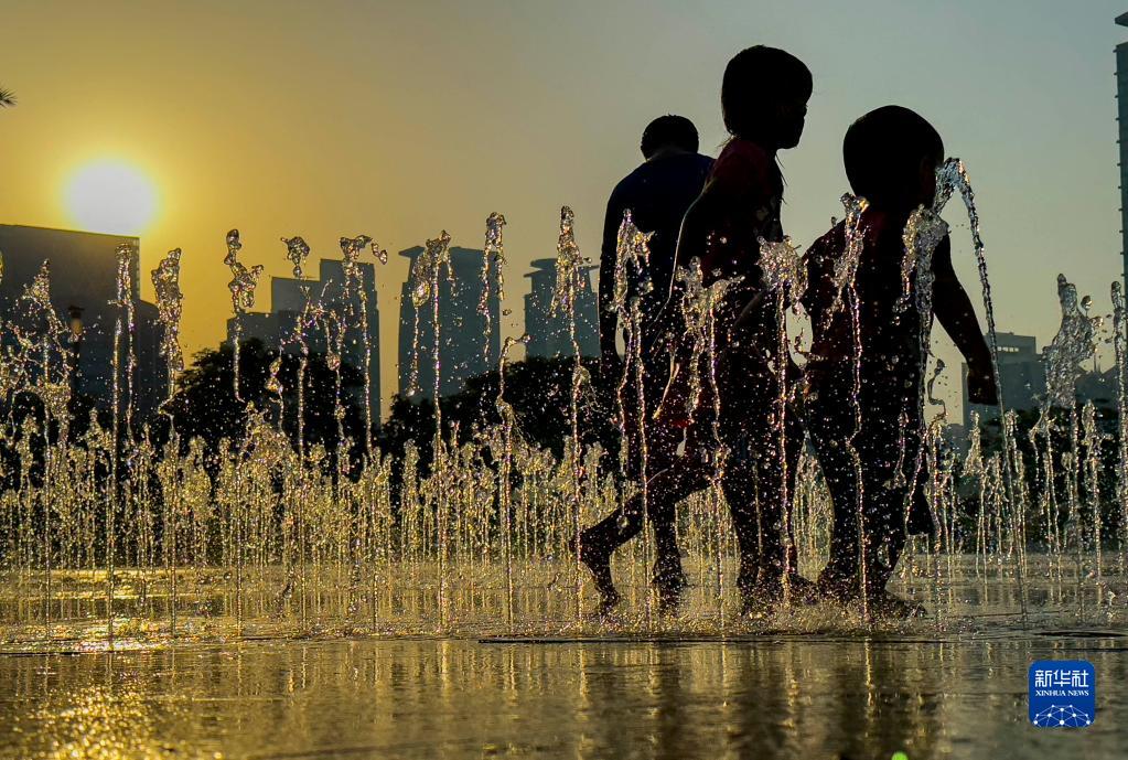 7月6日,在卡塔爾多哈,兒童在噴泉戲水納涼。