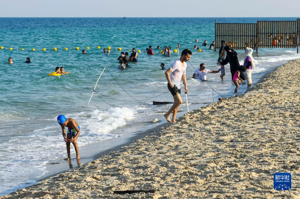 7月7日,在卡塔爾多哈,人們在海邊消暑。