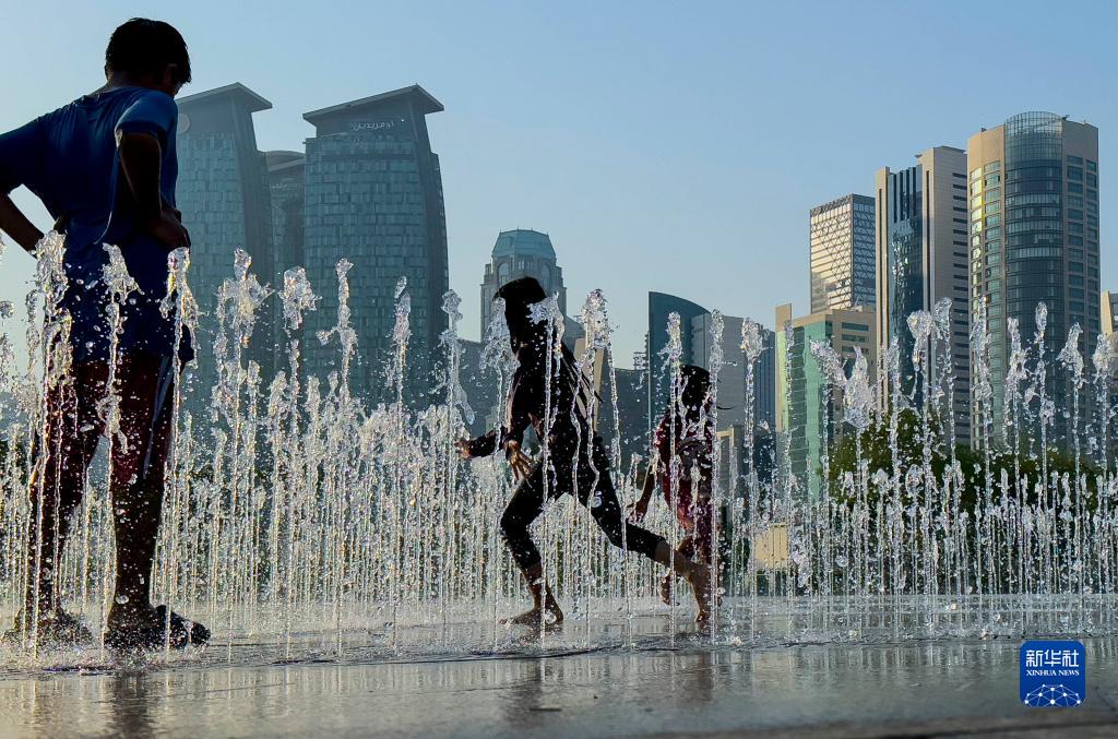 7月6日,在卡塔爾多哈,兒童在噴泉戲水納涼。
