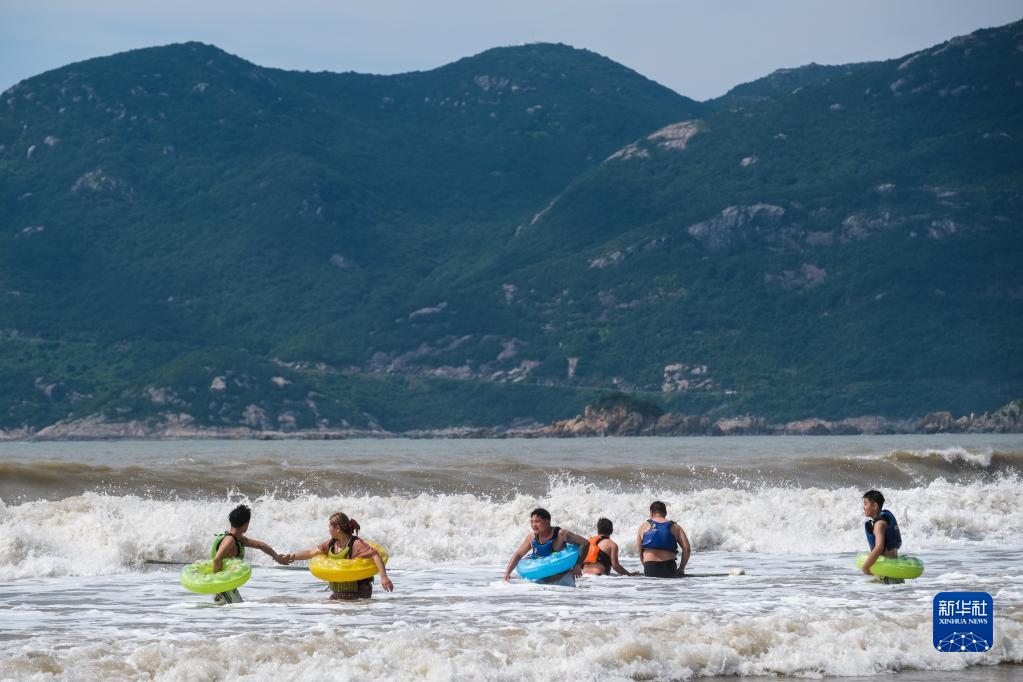 7月8日,游客在朱家尖南沙景區的沙灘上戲水。