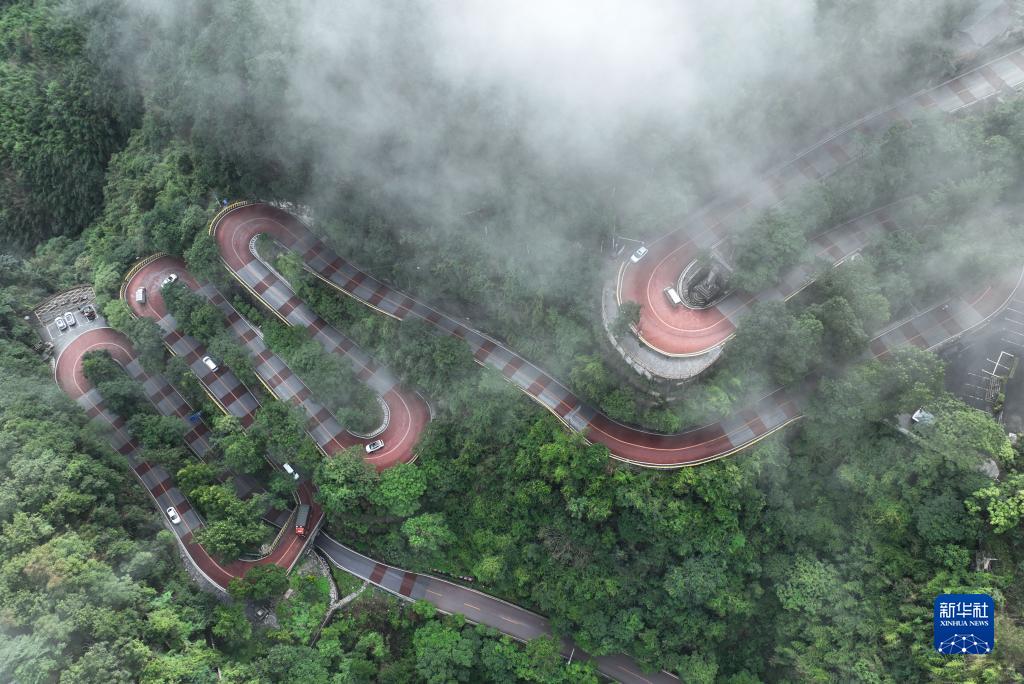 7月8日,雨過(guò)天晴后的湖南省湘西土家族苗族自治州吉首市矮寨特大懸索橋和矮寨盤(pán)山公路云霧繚繞,景色秀美。
