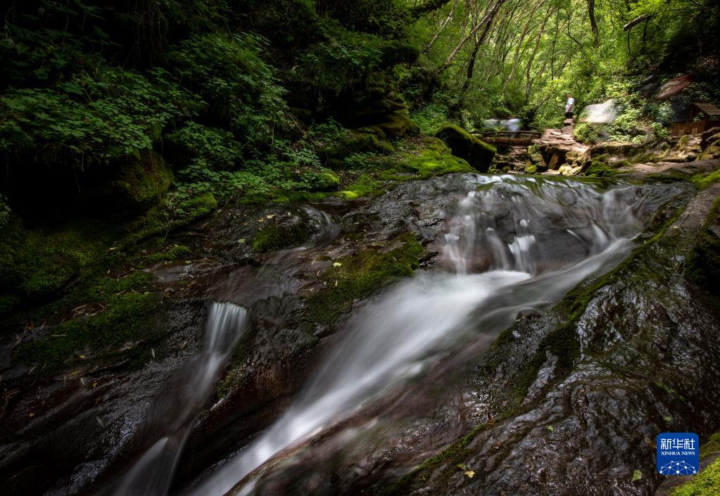 7月8日,游客徒步經(jīng)過(guò)六盤(pán)山國家森林公園內一處溪流。