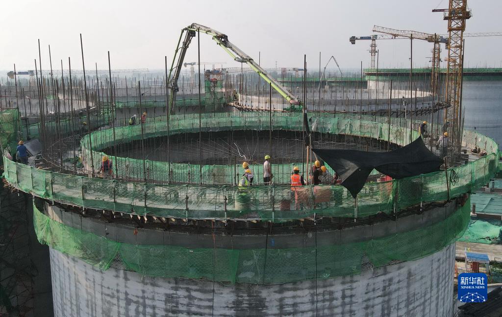 7月8日,工人在糧食安全應急儲備及食品深加工全鏈化綜合生產(chǎn)基地項目建設工地施工(無(wú)人機照片)。