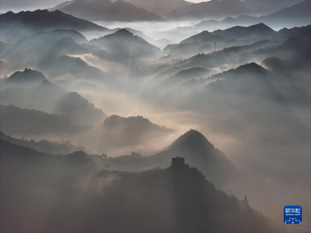 當日清晨,遷西縣境內的長(cháng)城附近晨霧繚繞,長(cháng)城、山峰、村莊、晨霧等呈現出壯美的水墨畫(huà)卷。
