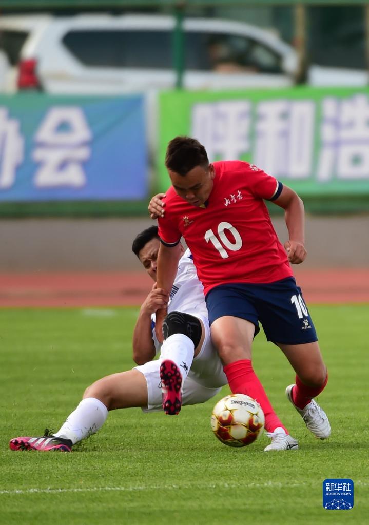 2021年7月20日,在第十四屆全國運動(dòng)會(huì )群眾組十一人制足球男子農村鄉鎮組的一場(chǎng)比賽中,巴達瑪斯仁(右)帶球突破。
