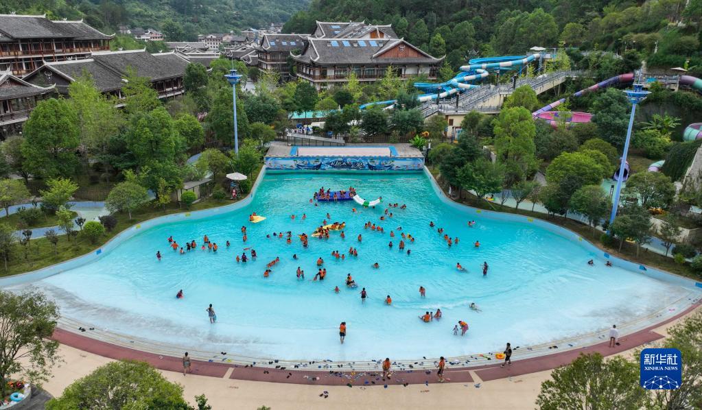 7月8日,在貴州省劍河縣溫泉小鎮,游客在戲水消暑(無(wú)人機照片)。