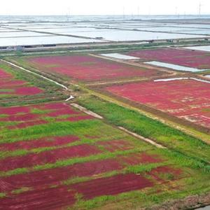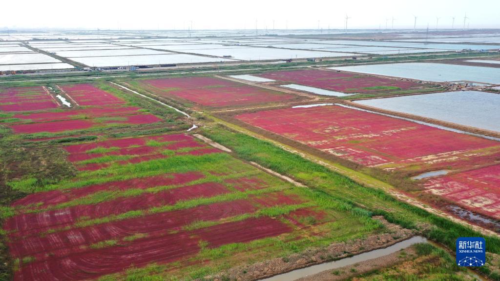 盛夏時(shí)節,江蘇省連云港市灌云縣燕尾港沿海灘涂濕地大片野生鹽蒿漸紅,如一片片紅毯鋪在大地上。