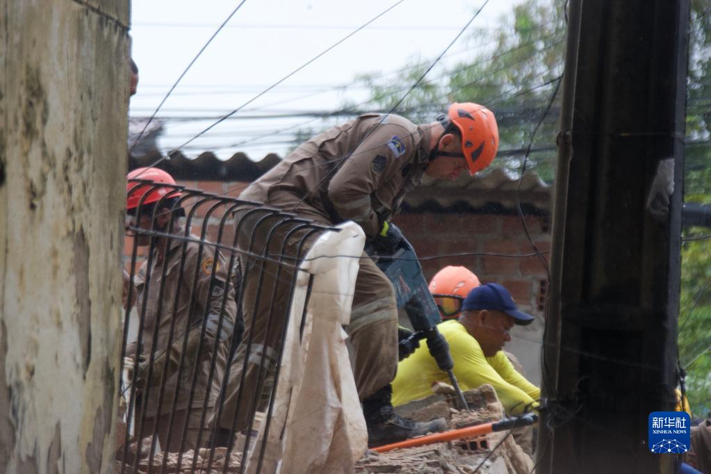 7月7日,救援人員在巴西伯南布哥州累西腓的建筑坍塌現場(chǎng)工作。