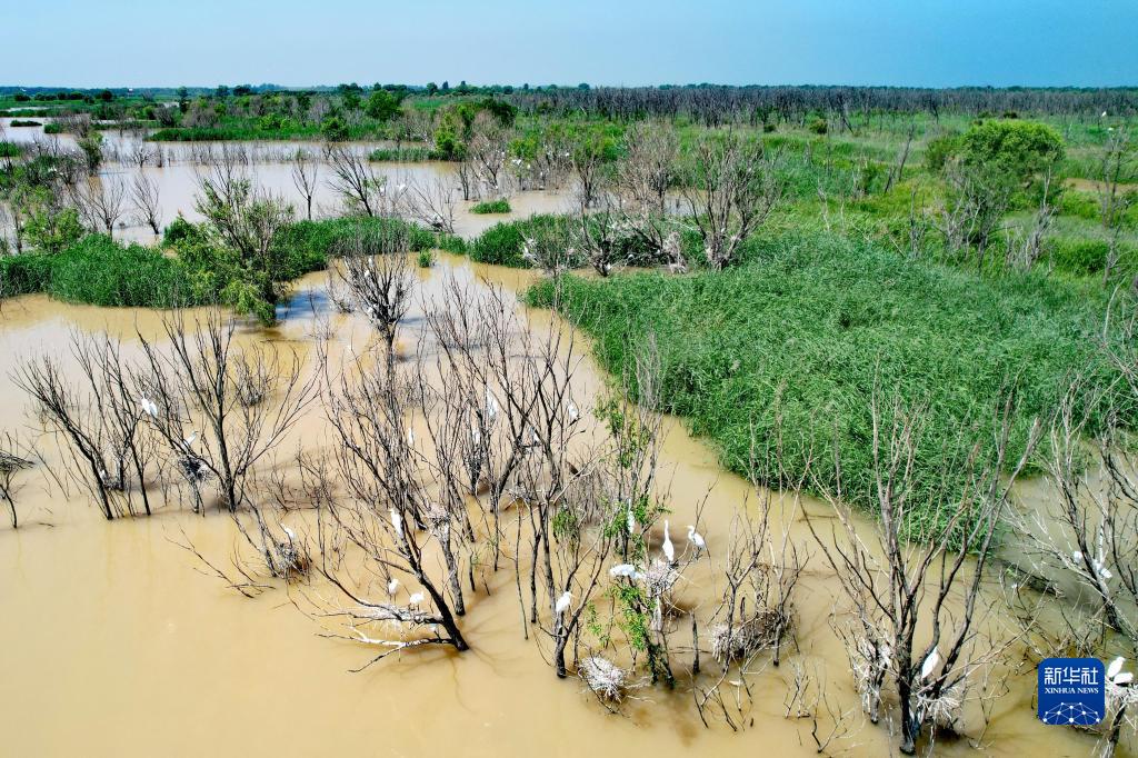 在黃河三角洲濕地拍攝的白鷺群(無(wú)人機照片,2023年6月30日攝)。