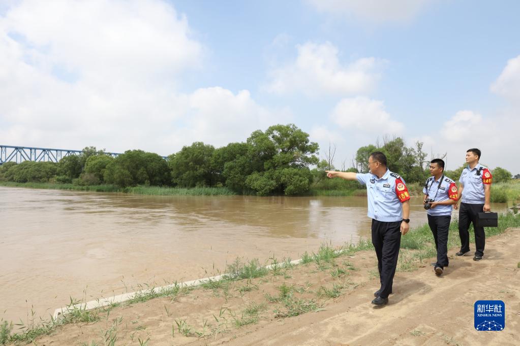 黃河派出所和黃河河務(wù)局水政監察大隊工作人員對刁口河生態(tài)補水進(jìn)行巡查(2023年6月29日攝)。