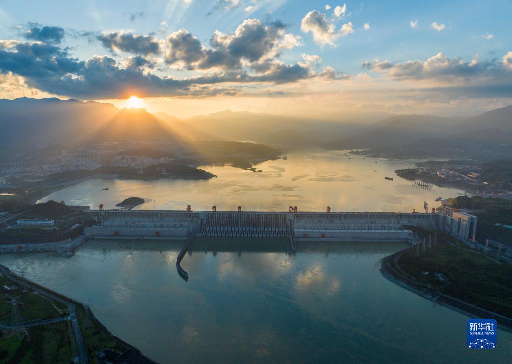 這是7月9日在湖北省宜昌市拍攝的夕陽(yáng)映照下的三峽水利樞紐工程(無(wú)人機照片)。