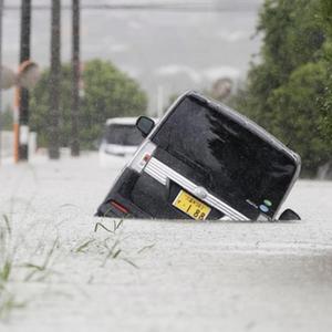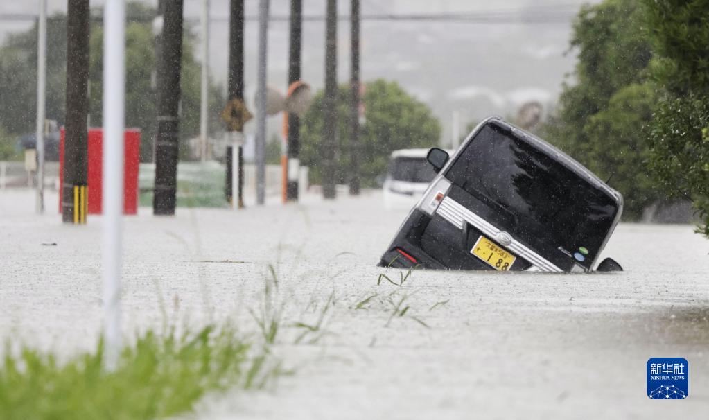 這是7月10日在日本福岡縣久留米市拍攝的被大雨圍困的汽車(chē)。