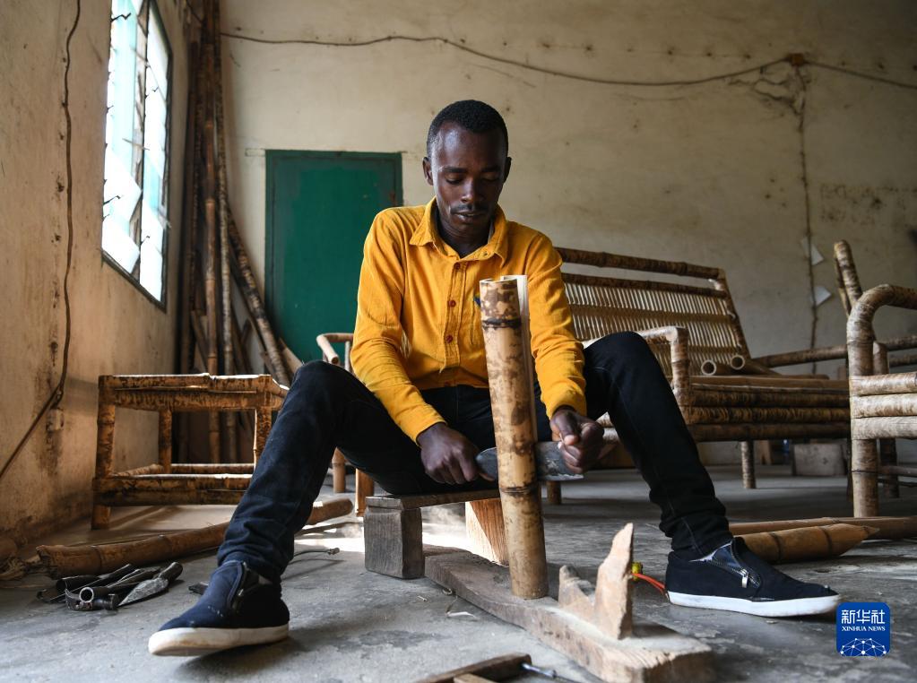 6月21日,在位于布隆迪經(jīng)濟首都布瓊布拉的卡蒙蓋手工業(yè)培訓中心,學(xué)員在生產(chǎn)車(chē)間制作竹家具。