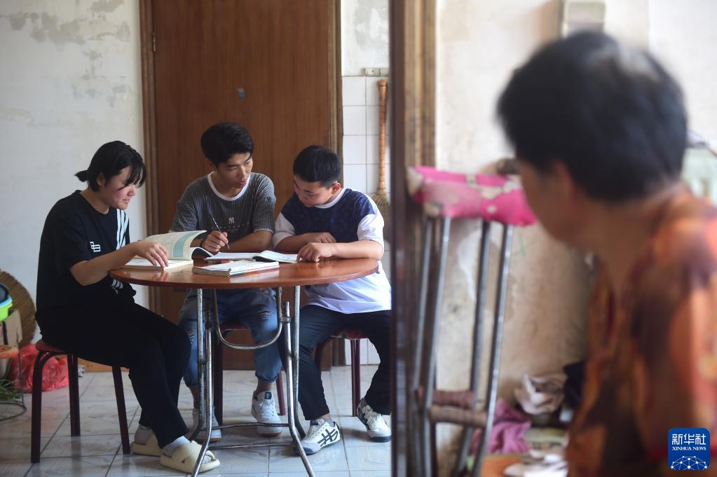 7月10日,在河北滄州,志愿者張志豪(中)為東姜官屯村兩名學(xué)生講解數學(xué)題。