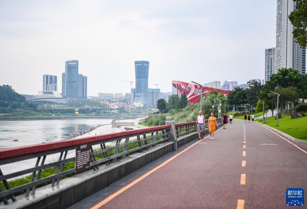 人們在四川省宜賓市三江口長(cháng)江邊的綠道上散步(6月28日攝)。