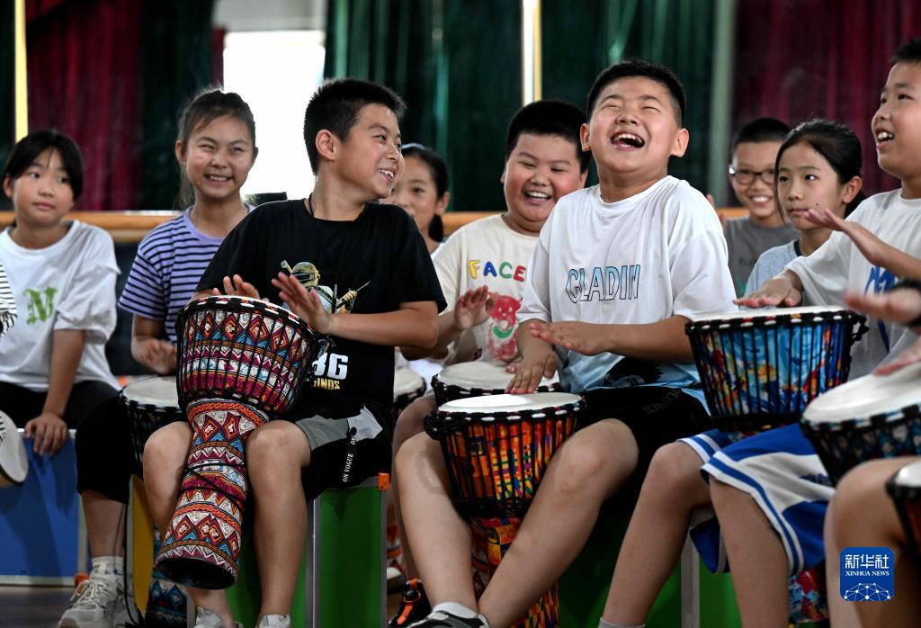 7月10日,學(xué)生在河北省石家莊市興華小學(xué)練習非洲鼓。