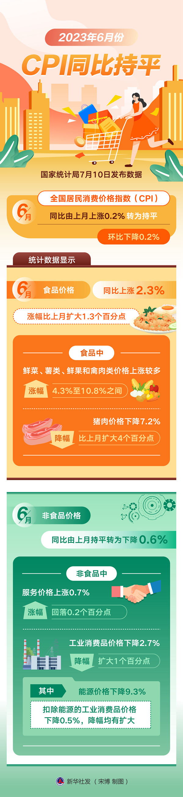 國家統計局7月10日發(fā)布數據,6月份,全國居民消費價(jià)格指數(CPI)同比由上月上漲0.2%轉為持平,環(huán)比下降0.2%。上半年,CPI平均比上年同期上漲0.7%。