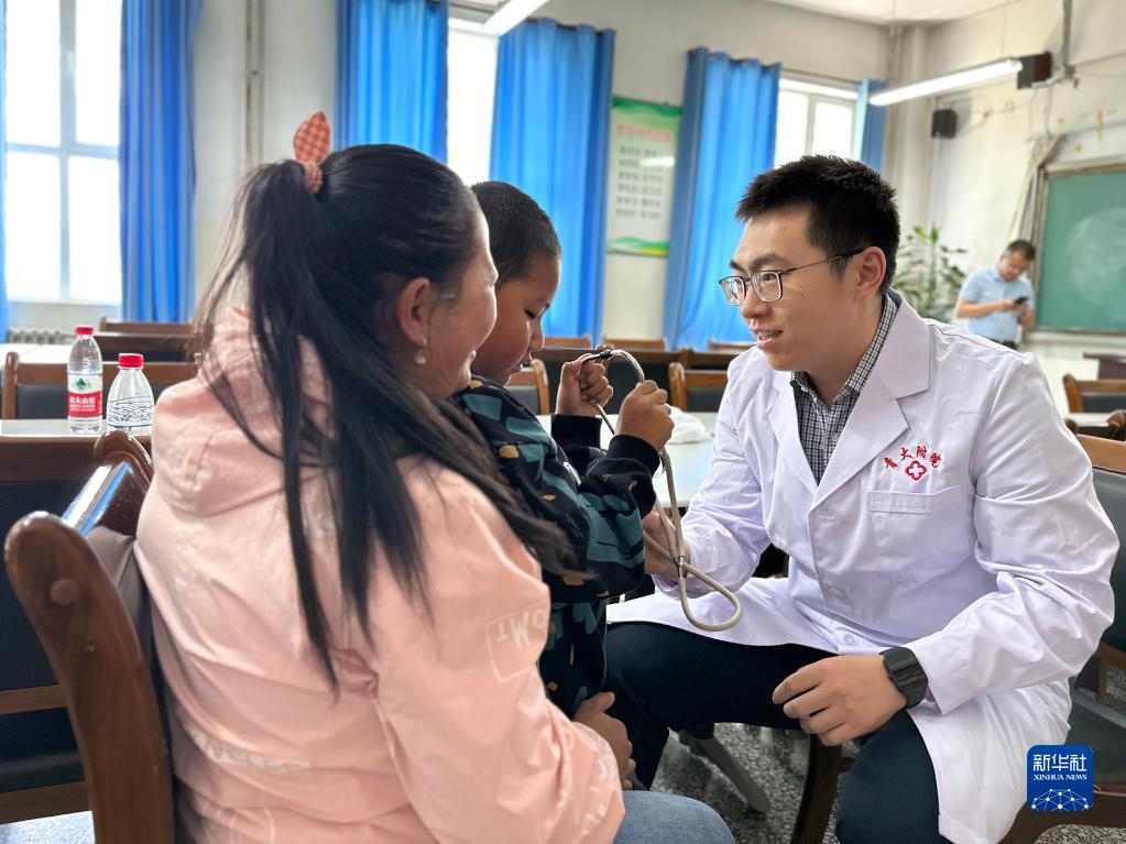 7月7日,北京協(xié)和醫院醫生在青海省海北藏族自治州海晏縣寄宿制民族中學(xué)與孩子和家長(cháng)交流,了解病情。