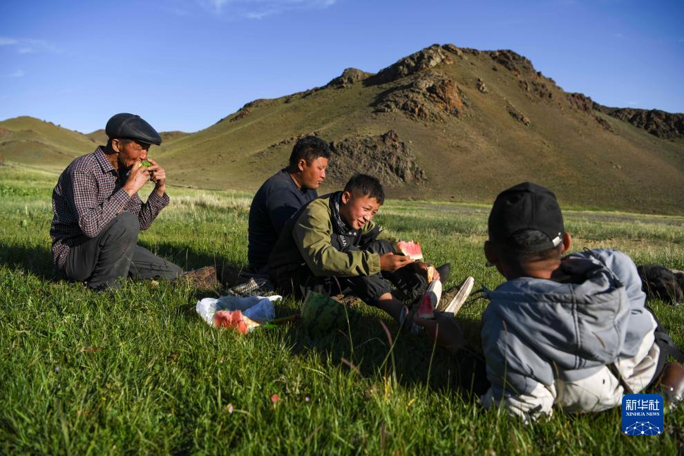 哈布得拉什么(左一)和他的弟弟朱馬爾(左二)、侄子寨桑(左三)、女婿阿依薩在轉場(chǎng)途中休息聊天(7月3日攝)。