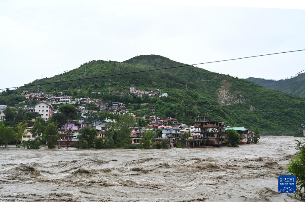 這是7月10日在印度喜馬偕爾邦曼迪地區拍攝的漲水的比亞斯河。
