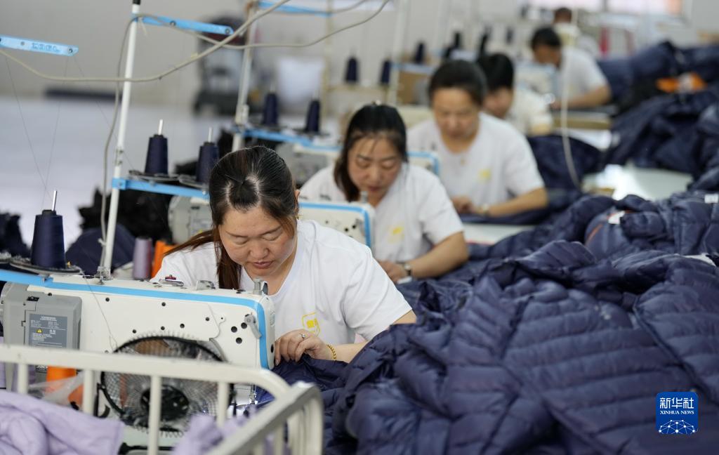 7月11日,河北省遷安市上射雁莊鎮七里坎村一家服裝加工企業(yè)的工人在制作羽絨服。
