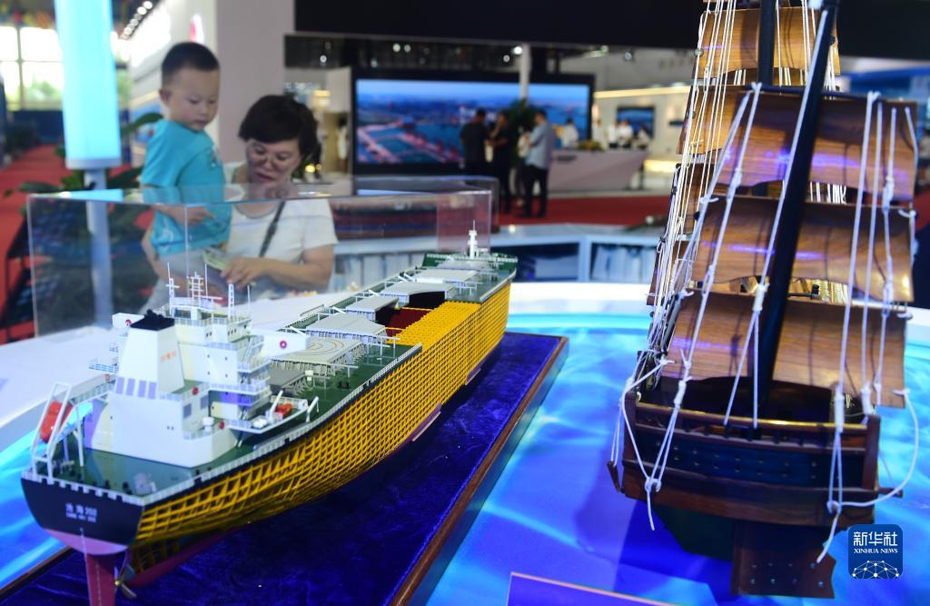 7月11日,參觀(guān)者在河北滄州舉行的2023年航??萍疾┯[會(huì )上了解造船技術(shù)。