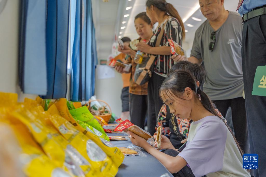 7月11日,旅客在5630次列車(chē)上的“列車(chē)集市”選購土特產(chǎn)。