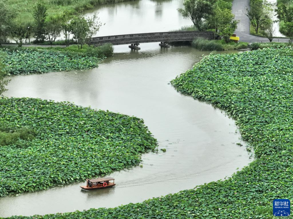 7月11日,游人乘船游覽穆溝古村(無(wú)人機照片)。