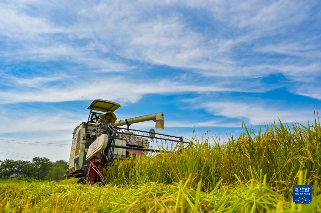 7月11日,在湖南省婁底市雙峰縣井字鎮白碧村,農民駕駛農機收割早稻。