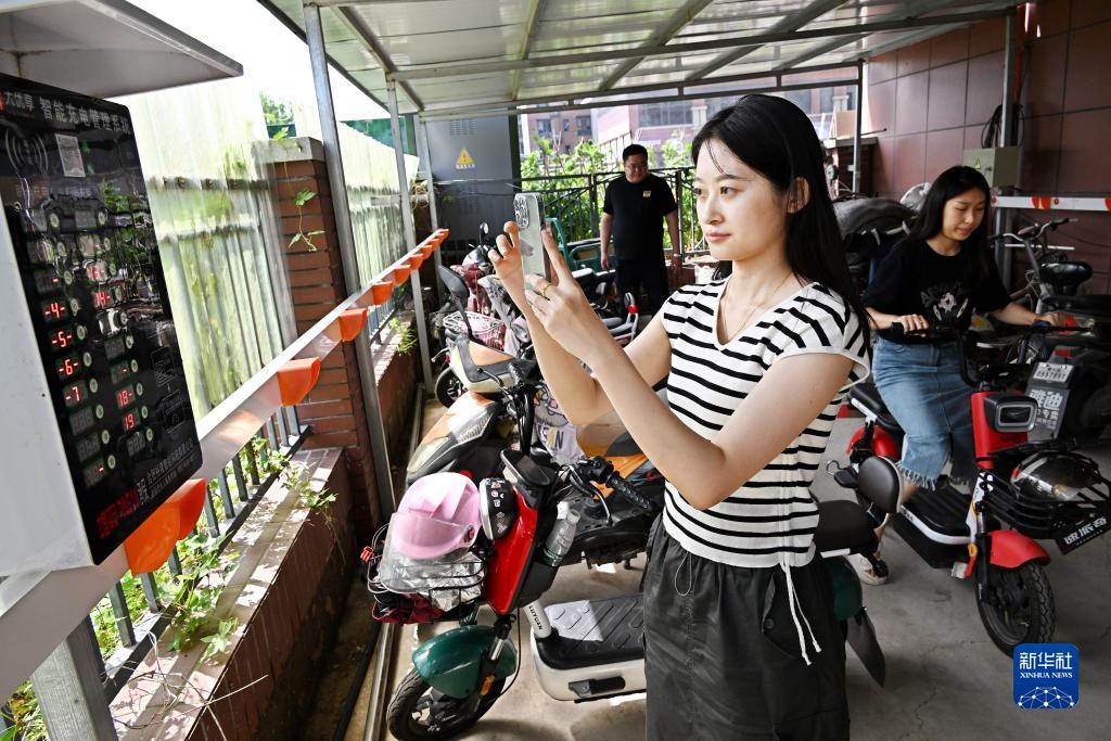 7月11日,市民在青島膠州市九龍街道臨水宜家小區一電動(dòng)自行車(chē)集中充電點(diǎn)掃碼充電。