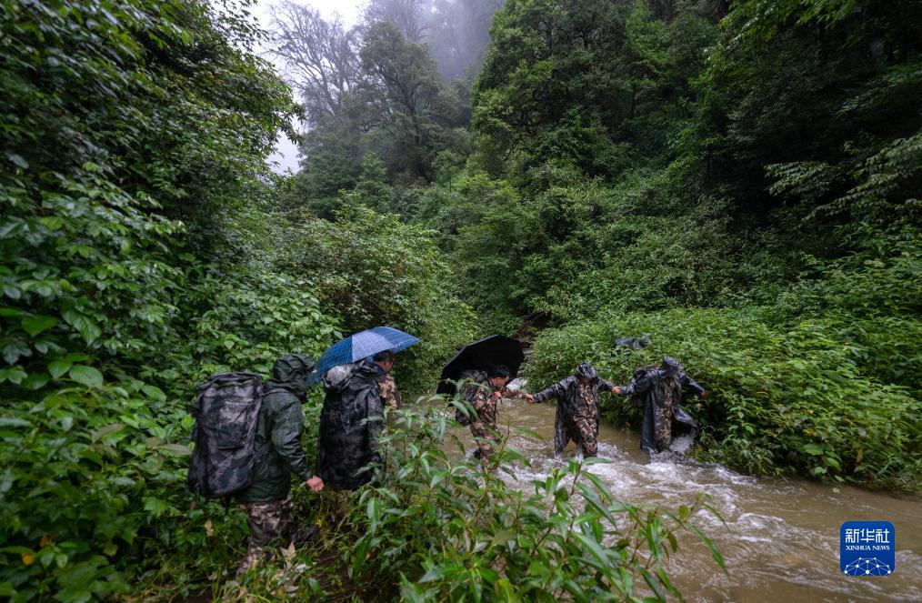 7月9日,在高黎貢山國家級自然保護區,巡護隊員相互幫助蹚過(guò)湍急的溪流。新華社記者 費茂華 攝