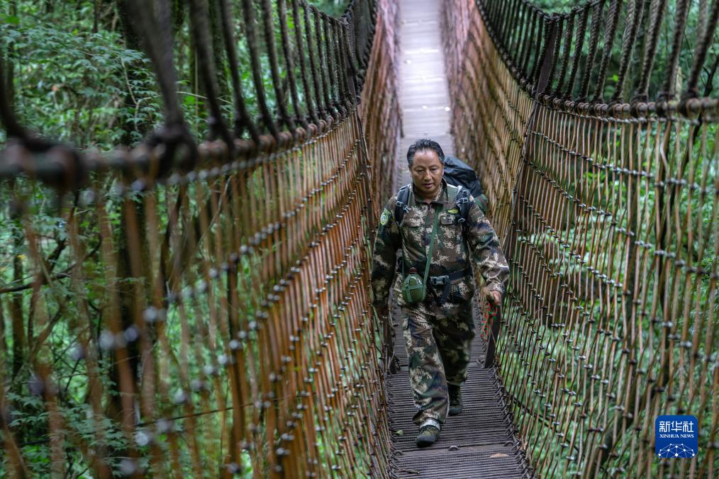 7月8日,何貴品穿過(guò)高黎貢山鹽馬古道上的索道橋,準備進(jìn)山巡護。新華社記者 費茂華 攝