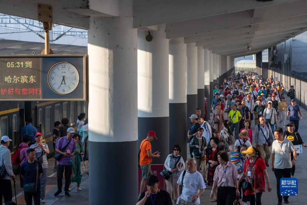 7月12日,在哈爾濱東站,乘坐Y449次旅游專(zhuān)列的乘客有序下車(chē)。